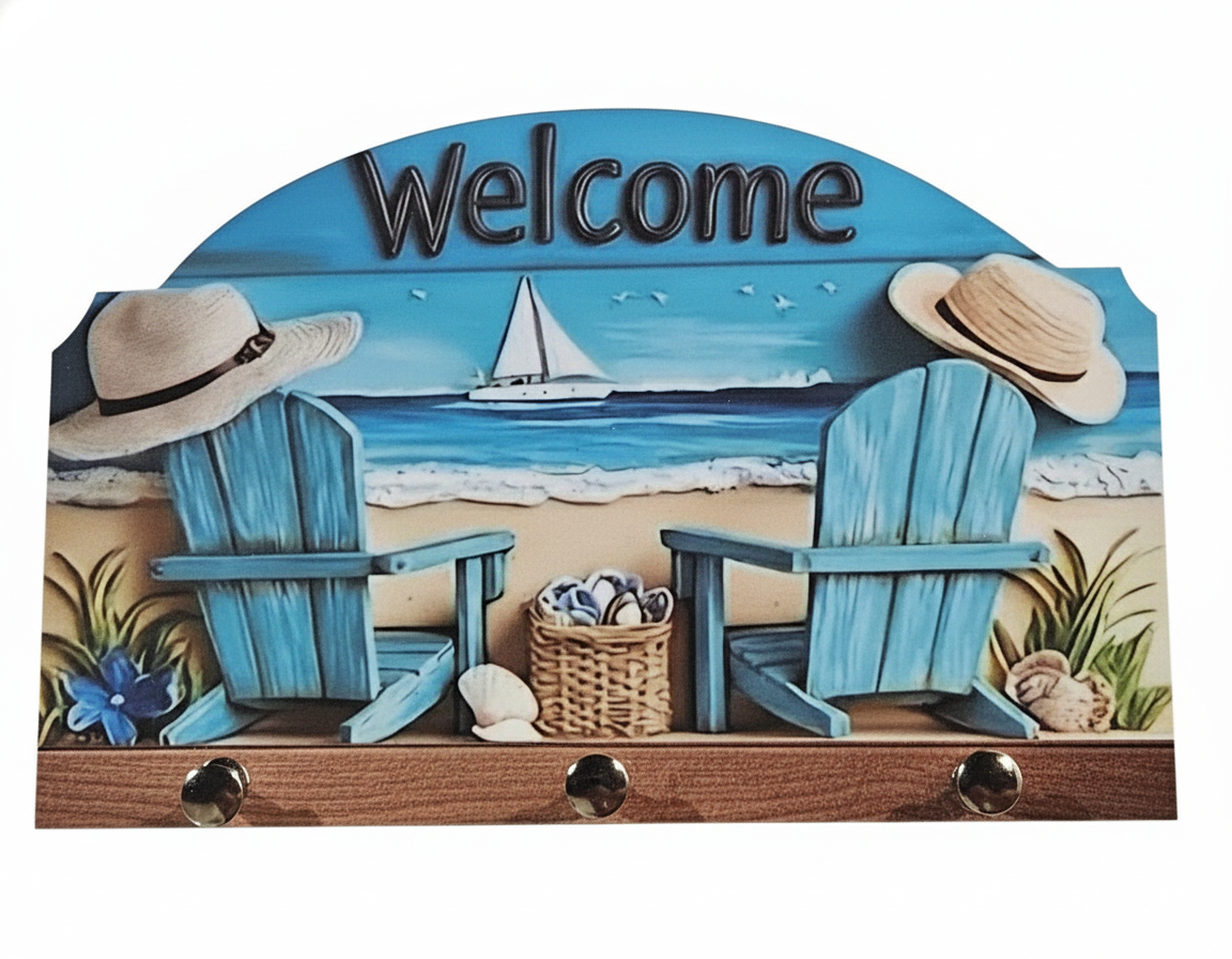 Transforme sua casa com o charme praiano deste Porta Chaves Welcome, produzido em MDF com impressão fotográfica laminada e efeito 3D realista. A cena com cadeiras de praia, chapéus, conchas e barco ao fundo traz leveza e elegância ao ambiente, criando uma decoração acolhedora e cheia de personalidade.